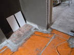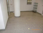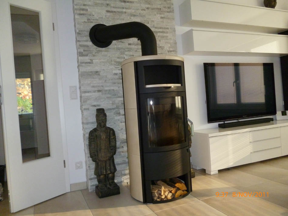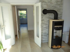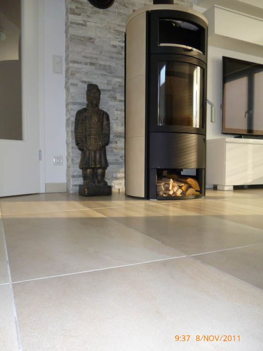 Durchgängig gefliester Wohnbereich - Eingelassener Holzofen mit Wandverkleidung aus Naturstein.